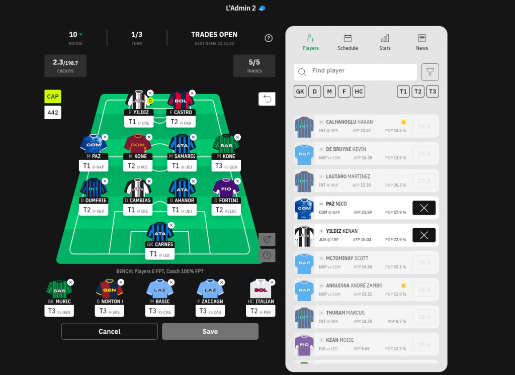 It’s been a hectic week in Serie A: just two days after the midweek round ended, we’re already back in action for Round 10. The previous round wasn’t entirely negative, as some of our chosen players delivered solid performances. For this round, we’ll focus on complementary picks and gambles, since we don’t want to give up our top assets—and our limited budget forces us into some rather “creative” choices.