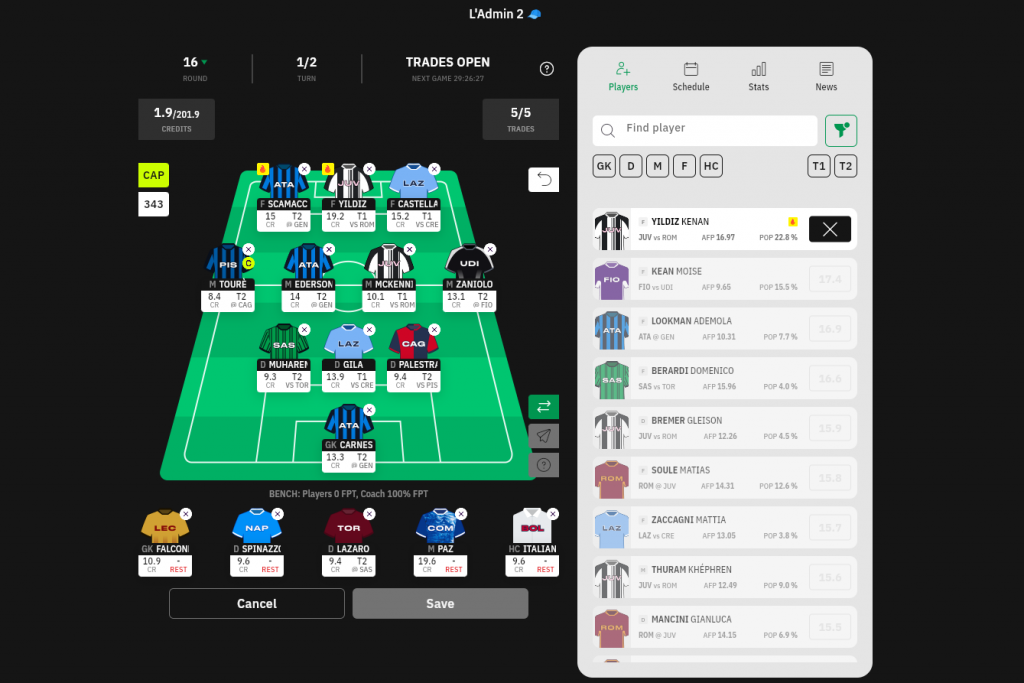 It’s Super Cup weekend: four matches out of ten have been postponed, and players from eight teams will be considered “rested” on Kickest. With limited choices available, let’s make our five transfers for Round 16 of Kickest and Serie A.