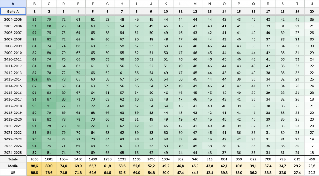 Nelle ultime 5 stagioni, la media punti della quarta classificata è stata di 71,8 pti, una proiezione perfettamente in linea con l’attuale piazzamento delle tre squadre coinvolte e che rende la corsa alla Champions ancora più avvincente. Il tutto, in attesa dei responsi del ranking UEFA: la Serie A, che conta sette squadre nelle tre competizioni, vuole provare a ripetere quanto accaduto due stagioni fa, quando permise alla quinta classificata in campionato, il meritevole Bologna di Thiago Motta, di qualificarsi direttamente al girone unico di Champions League.